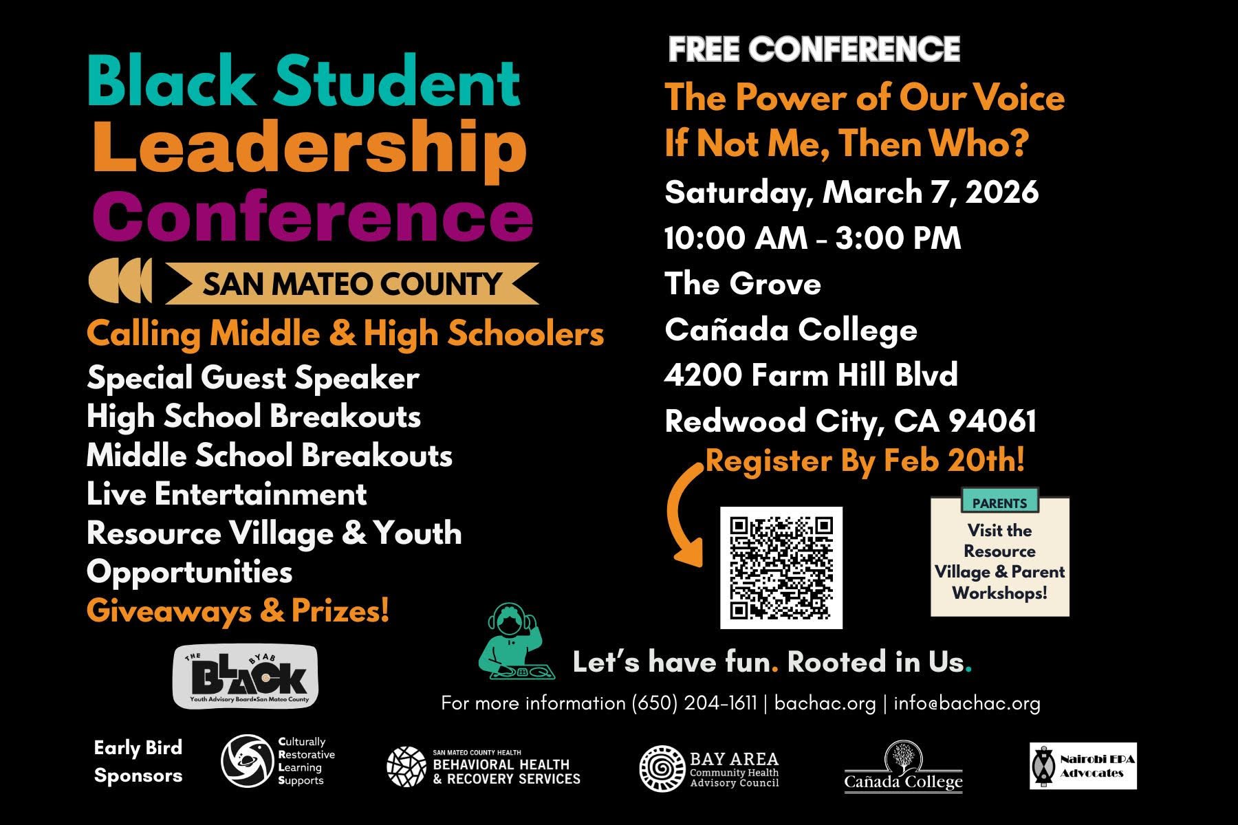 We would be honored to have middle and high school students living in or attending school in San Mateo County to join us for this historic event. They will be part of an empowering experience that uplifts Black student voices across San Mateo County. Parents and caregivers are warmly invited to attend as well. Please share our flier to help youth affirm their belonging and strengthen connection to community.